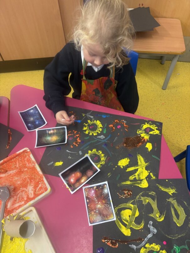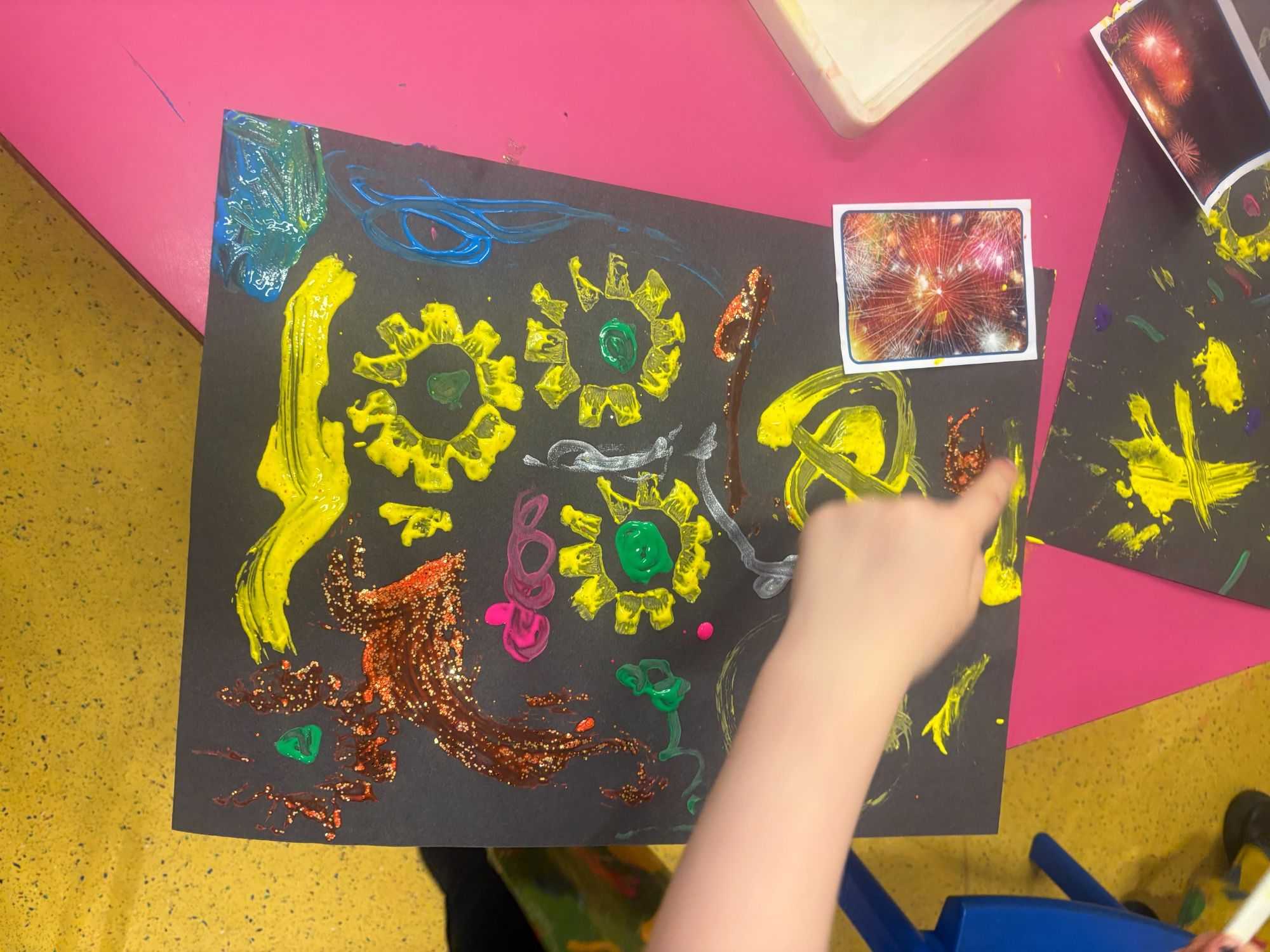 We have been talking about our own experiences of Fireworks and used lots of vocabulary to describe the colours we could see and the sounds we could hear! We made fabulous Firework art, using printing techniques and lots of glitter!
