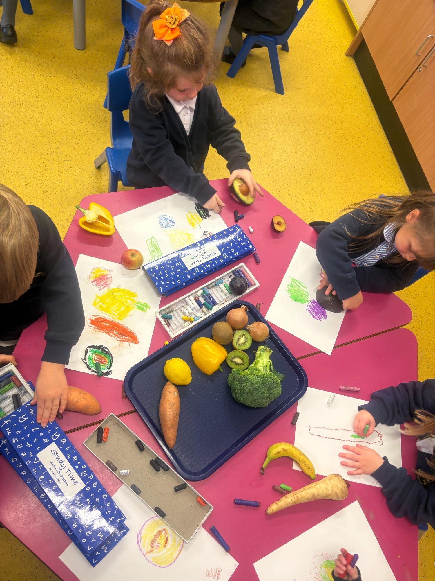 We took part in our first Harvest Assembly. We explored a range of fruit and vegetables, using our senses of touch, sight and smell to describe them. We produced some lovely observational drawings of some of our favourites.