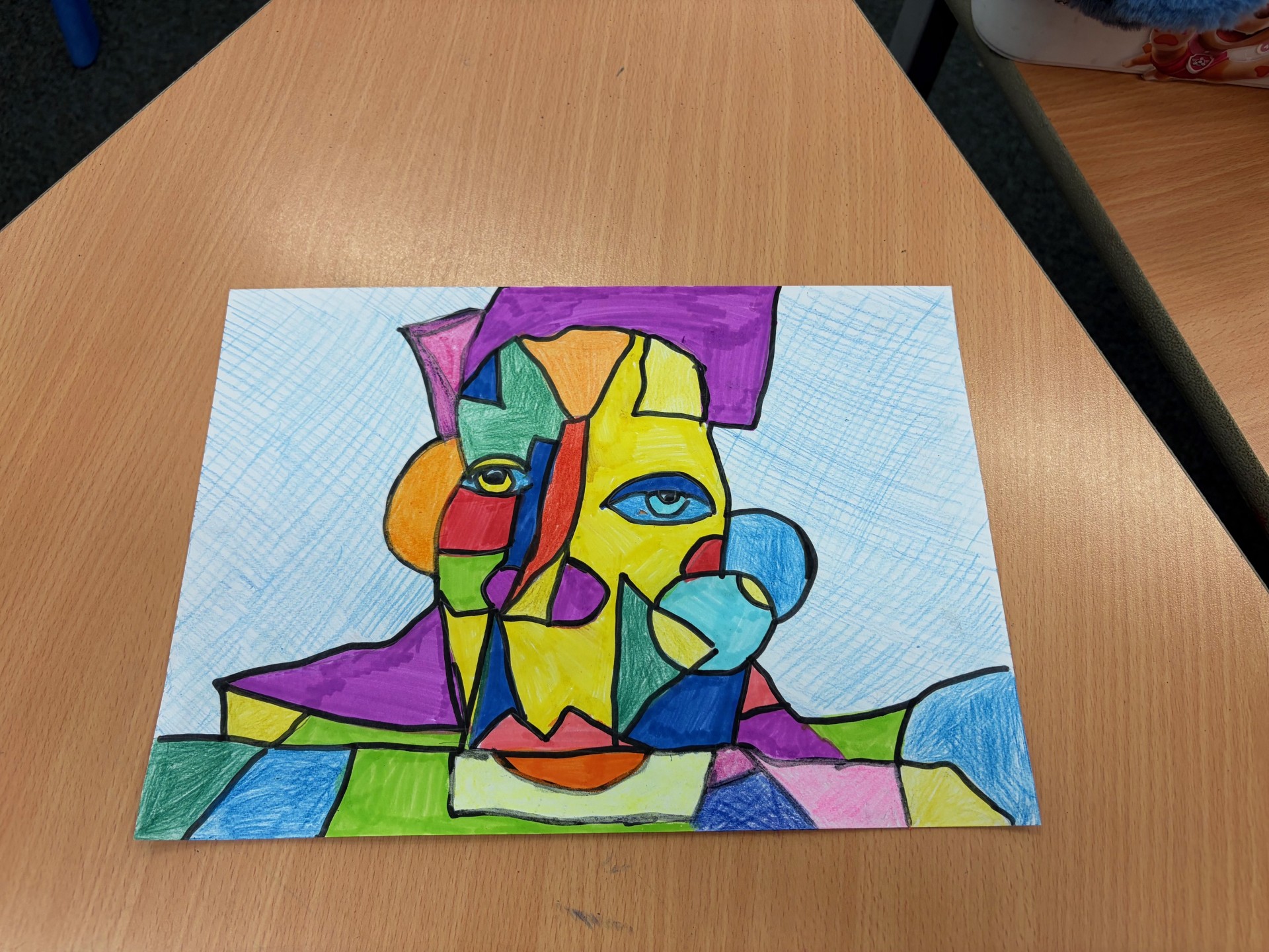 This week, we've been learning about Pablo Picasso and cubism. Here is a superb piece of artwork from someone in Class 4!