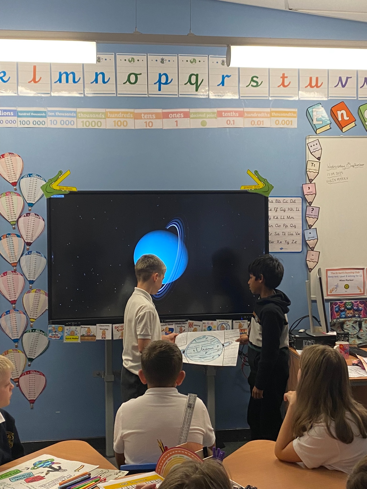We have all shown a great interest in our new Science topic, Space. In small groups, we were given a specific planet to research before presenting our interesting facts and findings to the class - we all did brilliantly! We then took ourselves outside (in a moment of sunshine) and used our posters to order the planets from closest to furthest away from the Sun.